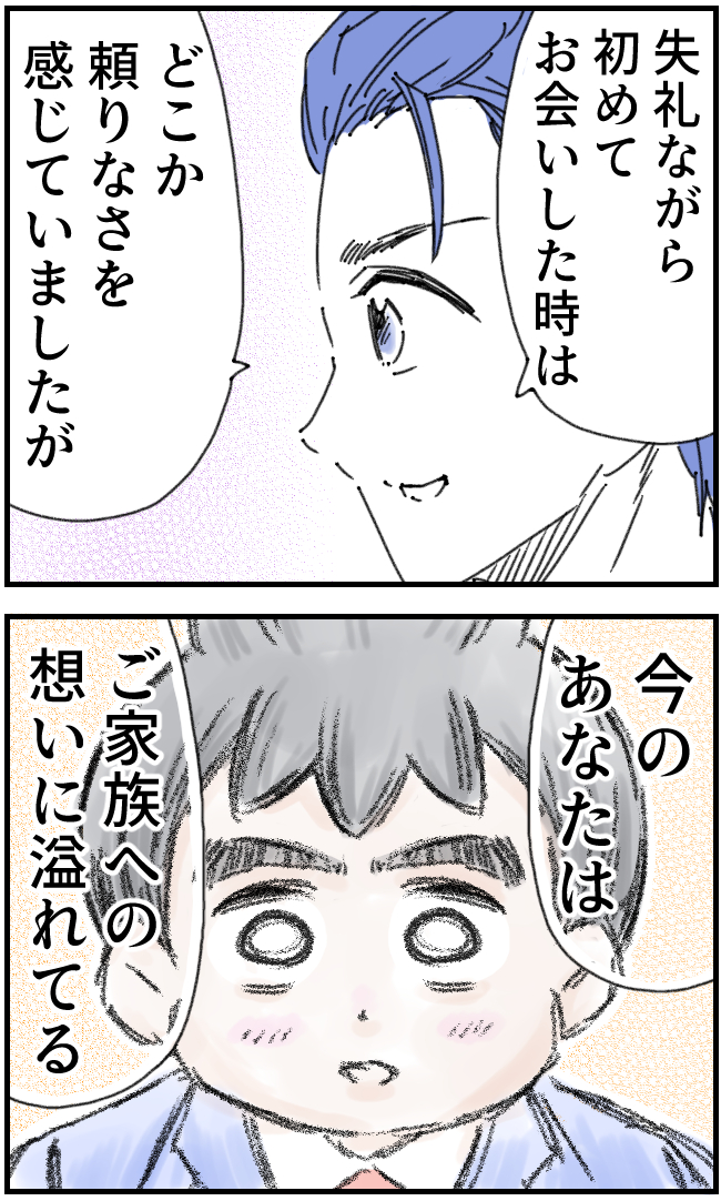 「失礼ながら、初めてお会いした時は、どこか頼りなさを感じていましたが、今のあなたはご家族への想いに溢れてる」いちろうさんを真っ直ぐみつめてそう話す佐山さん。
