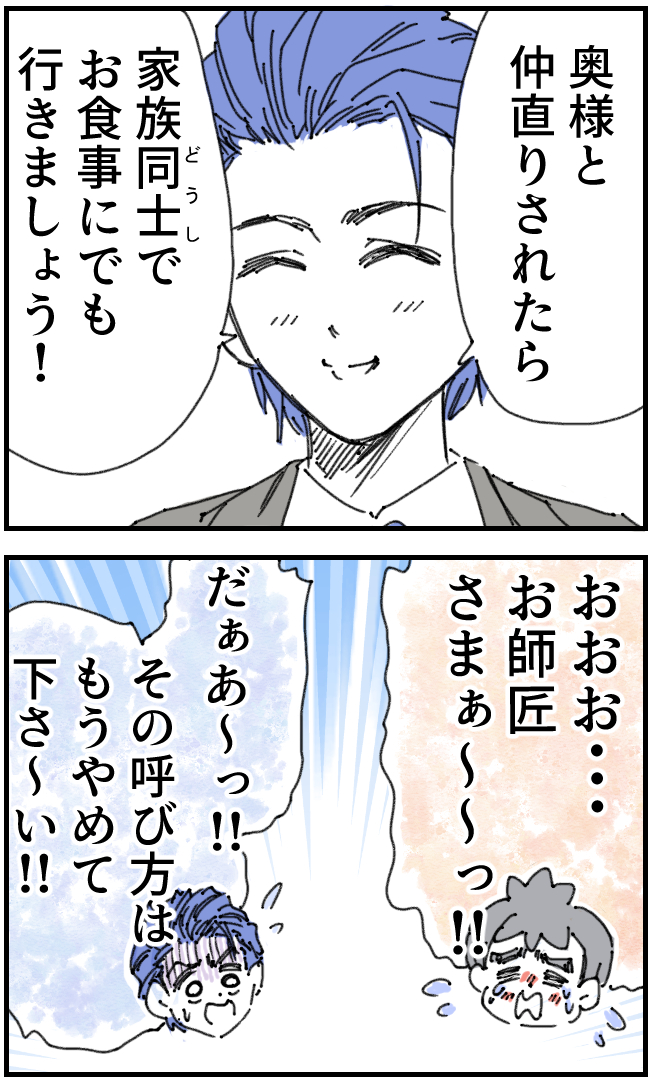 「奥様と仲直りされたら、家族同士でお食事にでも行きましょう!」佐山さんにそう言われて「おおお・・・お師匠さまぁ~~っ!!」と泣き出すいちろうさんに「だぁあ~っ!!その呼び方はもうやめてくださーい!!」佐山さんは顔を青くしながらそう言いました。