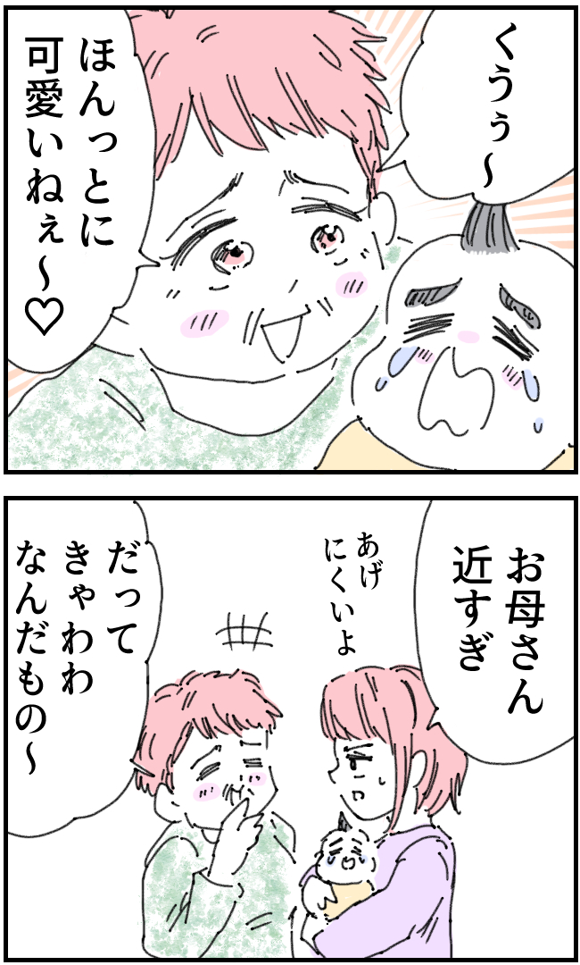 すると「くうぅ~!ほんっとに可愛いねぇ~」とこはるちゃんにメロメロなかおりさんのお母さん。「お母さん近すぎ。おっぱいあげにくいよ」とかおりさんに言われても「だって。きゃわわなんだもの~」とこはるちゃんがかわいくて仕方がない様子。