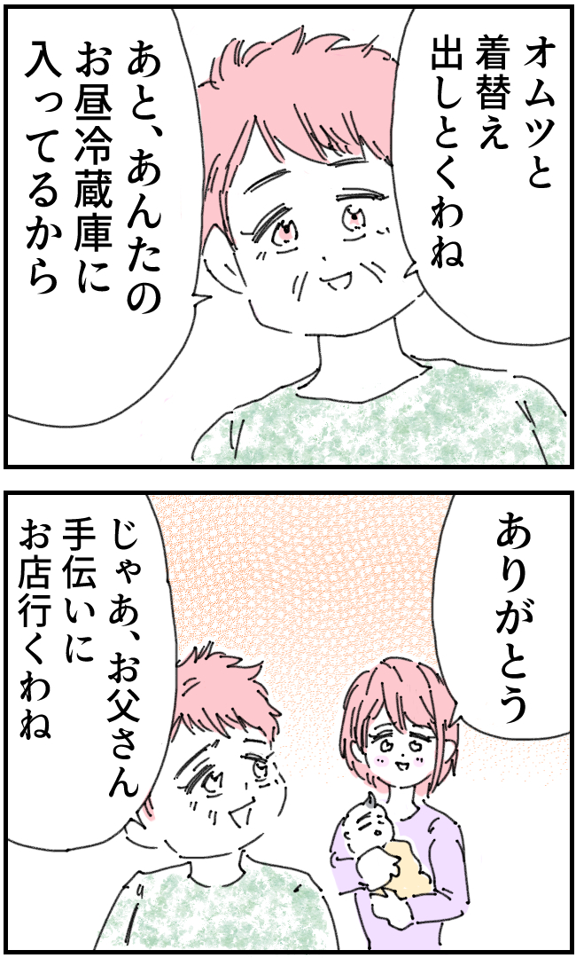 「オムツと着替え、出しておくわね。あと、あんたのお昼、冷蔵庫に入ってるから」と言うお母さんに、「ありがとう」とお礼を言うかおりさん。すると「じゃあ、お父さん手伝いにお店に行くわね」そう言ってお母さんは家を出て行きました。