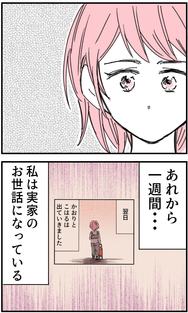 「あれから一週間・・私は実家のお世話になっている」かおりさんがこはるちゃんを連れて家を出てから、ちょうど一週間が経ちました。