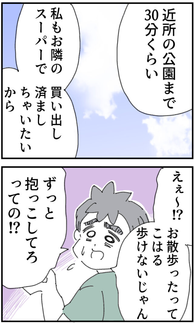 「近所の公園まで30分くらい、私もお隣のスーパーで買い出し済ましちゃいたいから」そう言われたいちろうさんは「えぇ~!?お散歩ったって、こはる歩けないじゃん。ずっと抱っこしてろっての!?」といちろうさんは文句タラタラでこたえました。