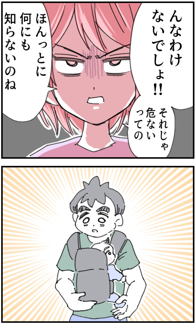 すると「んなわけないでしょ!!それじゃ危ないっての。ほんっとに何にも知らないのね」そう言って差し出されたのは抱っこ紐でした。こはるちゃんは、縦に抱っこされた状態でいちろうさんの胸の中にすっぽりおさまっています。
