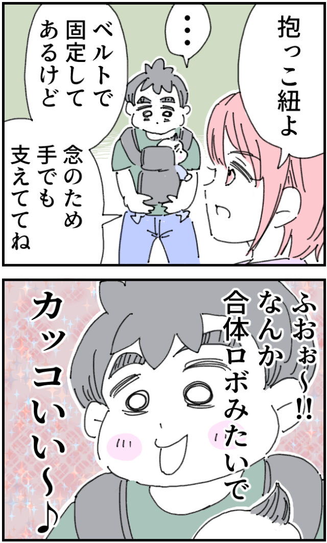 「抱っこ紐よ。ベルトで固定してあるけど、念のため手でも支えてね」かおりさんにそう言われて「・・・」無言だったいちろうさん、「ふおぉ~!!なんか合体ロボみたいでカッコいい~!」といちろうさんはうれしくなりました。