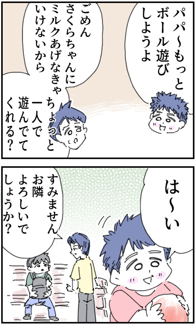 「パパ~、もっとボール遊びしようよ!」「ごめん。さくらちゃんにミルクあげなきゃいけないから、ちょっと一人で遊んでてくれる?」そう言われたたくちゃんは「は~い」と素直に返事をしました。すると「すみません、お隣よろしいでしょうか?」たくちゃんのパパがいちろうさんに声を掛けます。