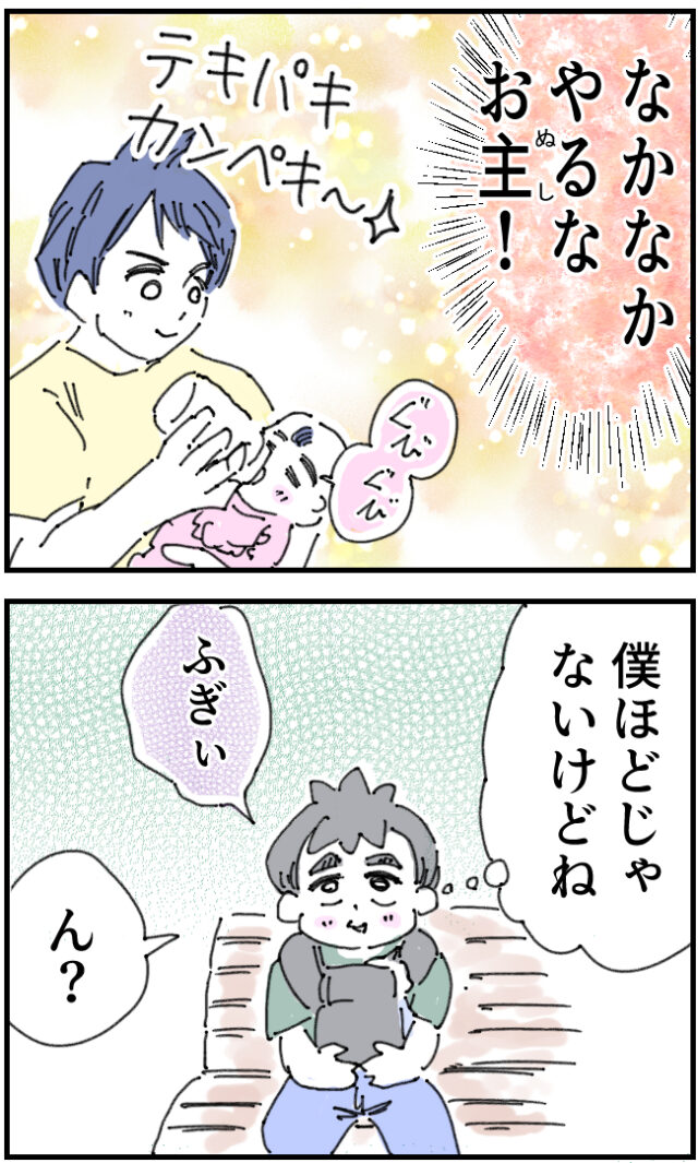 「なかなかやるな、お主!」テキパキと完璧に準備を整えて、さくらちゃんにミルクをああげるたくちゃんのパパに感心するいちろうさんは「僕ほどじゃないけどね」と心の中で呟きました。すると「ふぎぃ」と声がしました。「ん?」声の主はこはるちゃんでした。