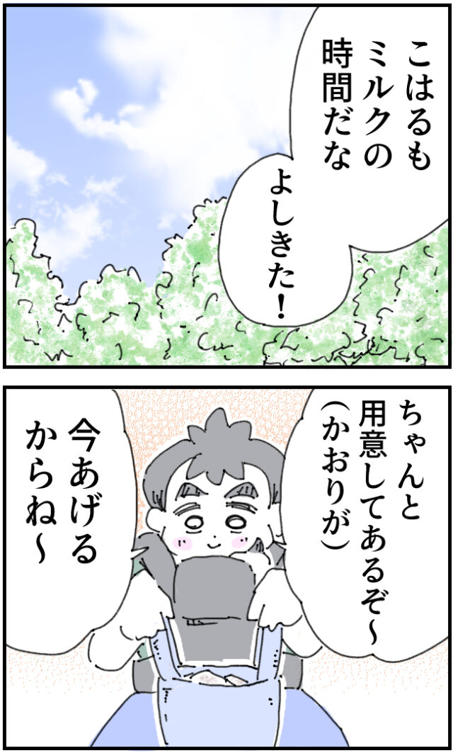 公園のベンチで「お隣よろしいでしょうか?」とたずねられたいちろうさん、ボールで遊んでいたたくちゃんのパパが妹のさくらちゃんにミルクをあげる為にベンチにやって来たのでした。「どうぞどうぞ」と答えるいちろうさんの隣で、テキパキとミルクの準備をするたくちゃんのパパ、それを見ながら「ほう・・なかなかやるなお主!」と感心しつつ「僕ほどじゃないけどね」と呟きました。すると「ふぎぃ」とこはるちゃんの声が。どうやらこはるちゃんもミルクが欲しいようで、「よしきた!」といちろうさんもミルクの準備を始めました。「ちゃんと用意してあるぞ~(かおりが)。今あげるからね~」と呟きながらバッグの中を見ると、「え!?ミルク入ってないじゃん!!お湯と水だけ!?かおりの奴ミスったな!?」と文句を言ういちろうさんは「なんだこりゃ!?」とミルクと書かれたスティックを見つけて首をひねりました。