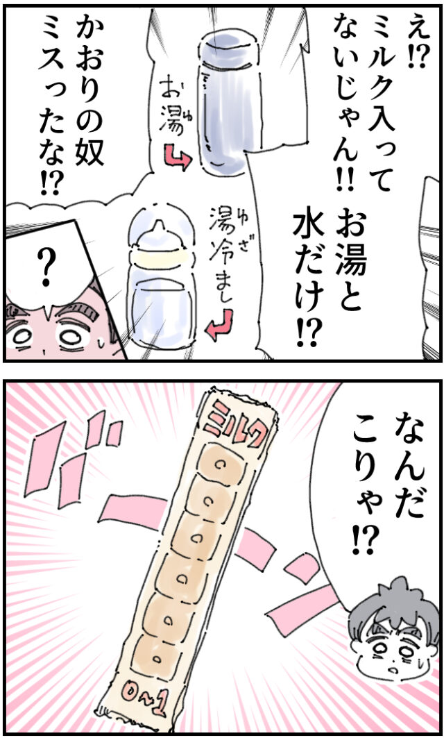 「え!?ミルク入ってないじゃん!!お湯と水だけ!?かおりの奴ミスったな!?」と驚くいちろうさん、そして、[ミルク]と書かれた袋を見つけたいちろうさんは「なんだこりゃ!?」と首を傾げました。