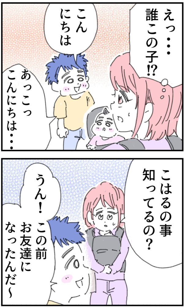 驚いたかおりさんが「こはるの事知ってるの?」と聞くと、「うん!この前お友達になったんだ~」と男の子が教えてくれました。
