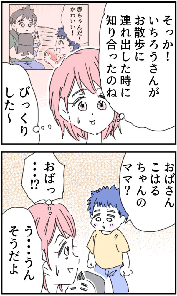 「そっか!いちろうさんがお散歩に連れ出した時に知り合ったのね」とかおりさんが納得していると、「おばさん、こはるちゃんのママ?」と男の子が聞くので「う・・・うん、そうだよ」と答えました。