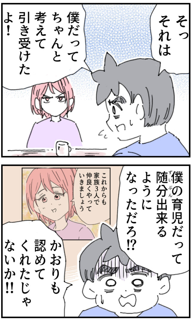 「そっ、それは・・僕だってちゃんと考えて引き受けたよ!」と答えるいちろうさん、「僕の育児だって随分できるようになっただろ!?かおりも認めてくれたじゃないか!!」必死に言葉を続けます。