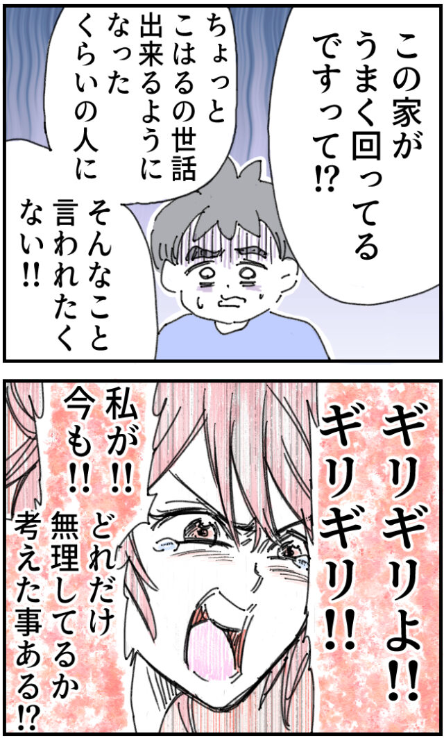 そして「この家がうまく回ってるですって!?ちょっとこはるの世話できるようになったくらいの人に、そんなこと言われたくない!!」「ギリギリよ!!ギリギリ!!私が!!今も!!どれだけ無理してるか考えたことある!?」かおりさんが涙ながらに訴えました。