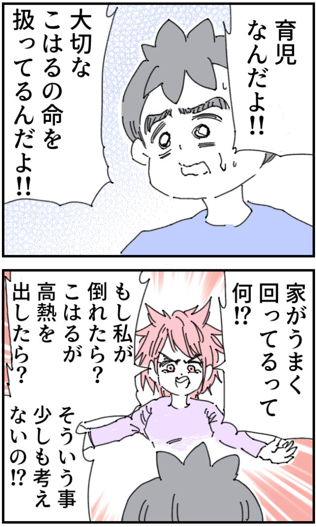 「育児なんだよ!!大切なこはるの命を扱ってるんだよ!!」かおりさんの言葉に返す言葉がないいちろうさん、「家がうまく回ってるって何!?もし私が倒れたら?こはるが高熱を出したら?そういう事少しも考えないの!?必死に話し続けるかおりさん。