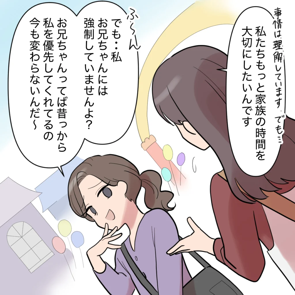 「事情は理解しています・・・でも、私たちもっと家族の時間を大切にしたいんです」そう訴えますが、カオルさんはどこか勝ち誇ったような表情を浮かべて「私、お兄ちゃんには強制していませんよ?お兄ちゃんってば昔っから私を優先してくれてるの、今も変わらないんだ~」と余裕たっぷりに言い放ちます。