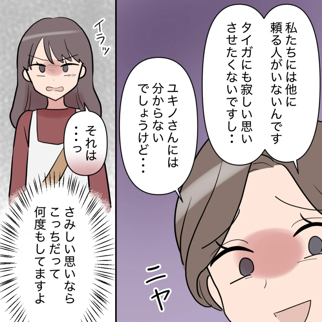 「私たちには他に頼る人がいないんです、タイガにも寂しい思いさせたくないですし・・・ユキノさんには分からないでしょうけど」そう言って、カオルさんは意地悪そうに笑います。さみしい思いならこっちだって何度もしているのに・・・私はそう言いたい気持ちをぐっと堪えます。