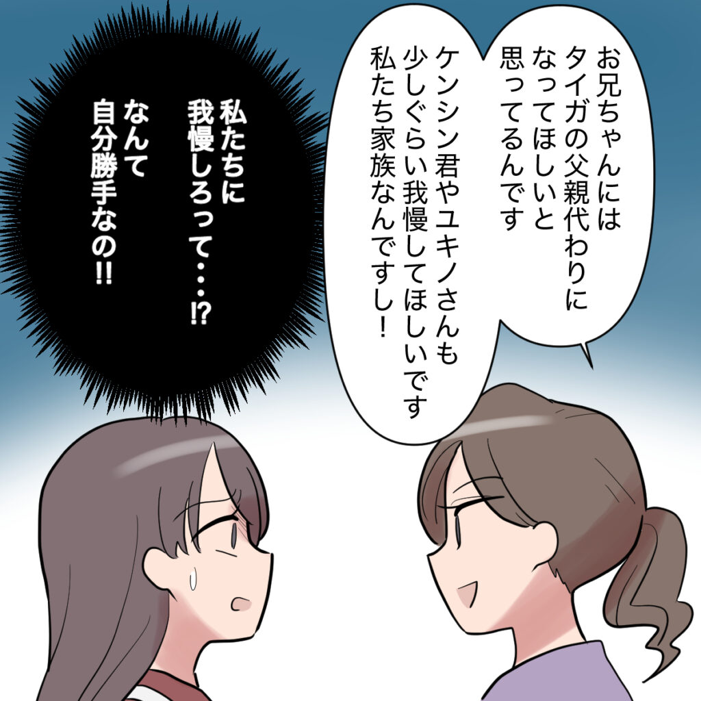 「お兄ちゃんにはタイガの父親代わりになってほしいと思ってるんです、ケンシン君やユキノさんも少しくらい我慢してほしい、私たち家族なんですし!」と、当たり前のように言い放つカオルさん。私たちに我慢しろって・・・!?あまりにも身勝手な言い分に、怒りが込み上げました。