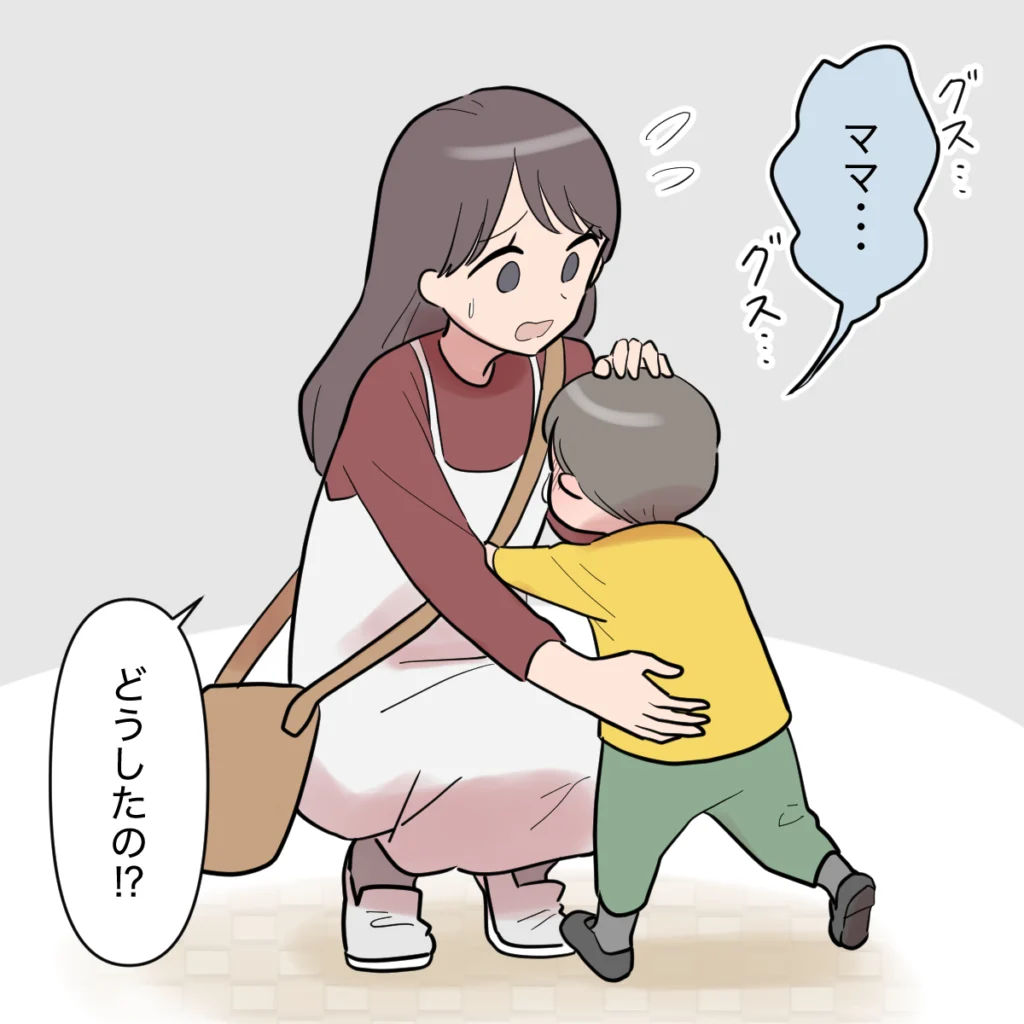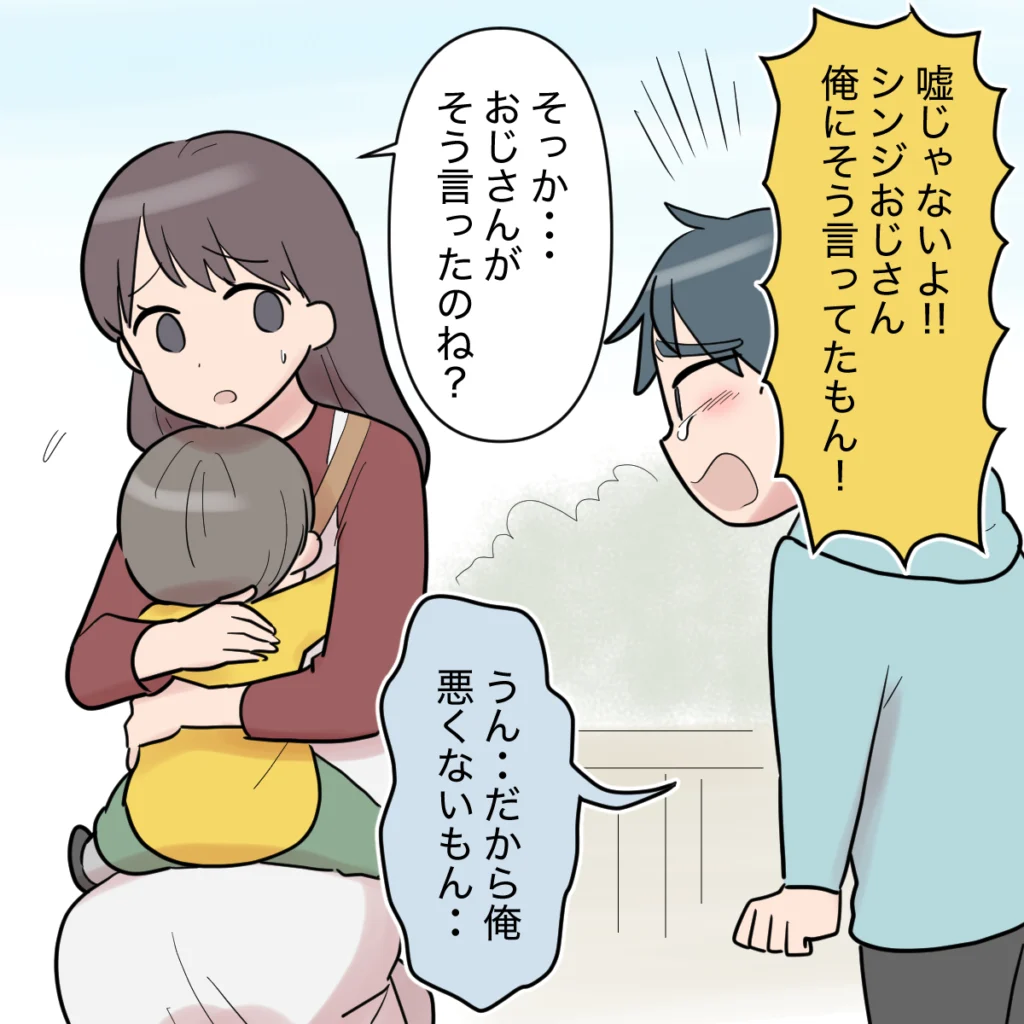 「シンジおじさんは俺の方が好き」「俺のパパって思っていいよって言った」と、タイガ君に心ない言葉を突き付けられたケンシンは、必死にこらえていた涙を抑えきれず、ついに泣き出してしまいました。泣き声に気づき、慌ててケンシンのもとへ駆け寄ると、彼は嗚咽を漏らしながら「ママ・・・」と私に抱きついてきました。