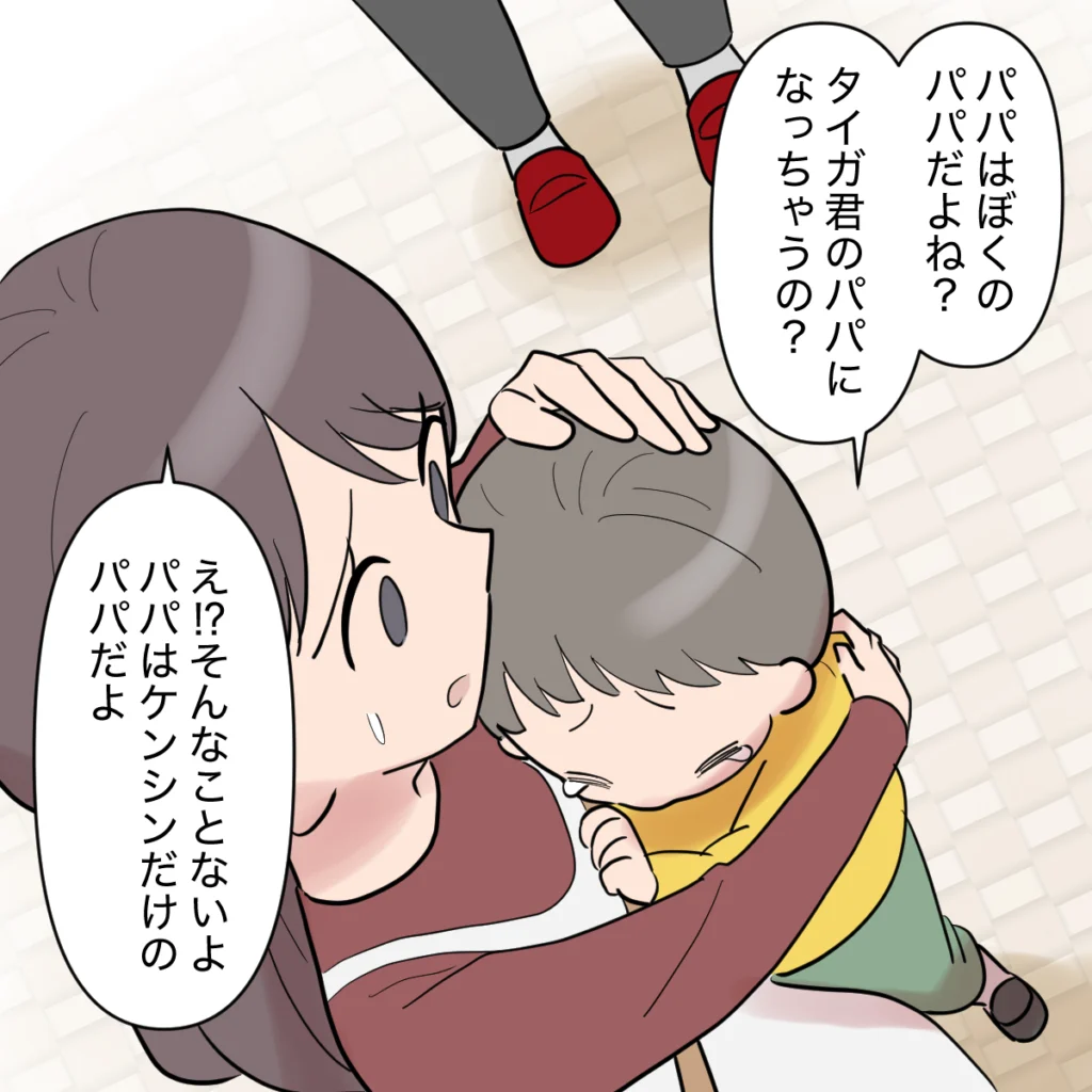 「パパはぼくのパパだよね?タイガ君のパパになっちゃうの?」涙声でそうつぶやくケンシンの姿に、胸が締め付けられます。私はケンシンを抱き寄せると、「そんなことないよ、パパはケンシンだけのパパだよ」と、はっきり伝えました。