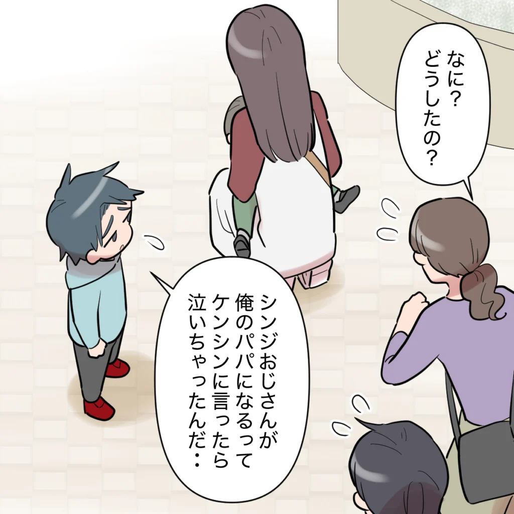 すると騒ぎに気づいたのか、カオルさんとシンジが慌てて駆け寄ってきました。タイガ君は「シンジおじさんが俺のパパになるってケンシンに言ったら泣いちゃったんだ・・・」と起こったことを正直に打ち明けました。