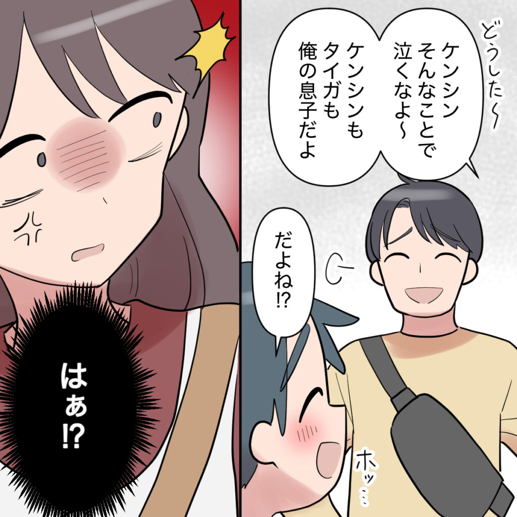 しかし、この事態を招いた張本人であるシンジは、「ケンシン、そんなことで泣くなよ~ケンシンもタイガも俺の息子だよ」と軽く流すだけ。何言ってるの?あなたの息子はケンシンだけでしょ!?あまりにも楽観的で、子どもの気持ちを軽視したシンジの態度に怒りが込み上げました。