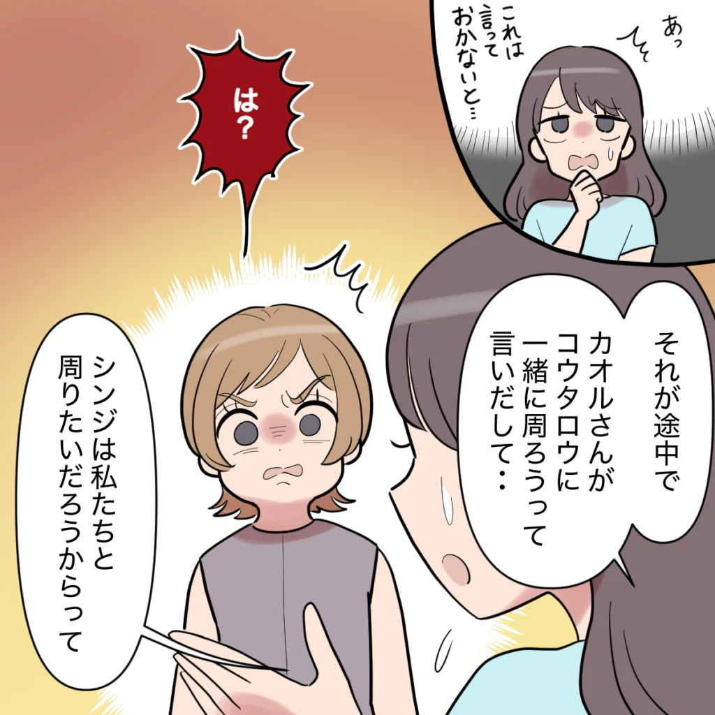 リンさんに今日の様子を聞かれた私は、これだけは伝えておかなければと思い「それが途中で、カオルさんがコウタロウに一緒に周ろうって言い出して・・・シンジは私たちと周りたいだろうからって」と、カオルさんに誘われた時のことを話しました。するとたリンさんは「は?」と眉を吊り上げ、コウタロウをジロリとにらみつけます。
