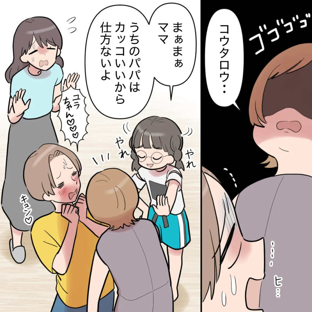 鬼のような形相のリンさんに詰め寄られたコウタロウは、「ヒ・・・」と声にならない悲鳴をあげ、肩を震わせます。しかしユラちゃんが、「まぁまぁママ、うちのパパはカッコいいから仕方ないよ」となだめたおかげで、リンさんの怒りはなんとか収まりました。