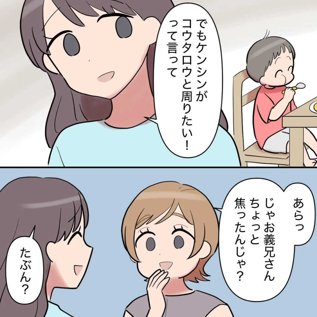 落ち着きを取り戻したリンさんに「カオルさんにはそう言われたけど、ケンシンがコウタロウと周りたいって言って・・・」と伝えると、リンさんはふっと口元を緩ませて「あらっ、お義兄さんちょっと焦ったんじゃ?」と嬉しそうに言いました。