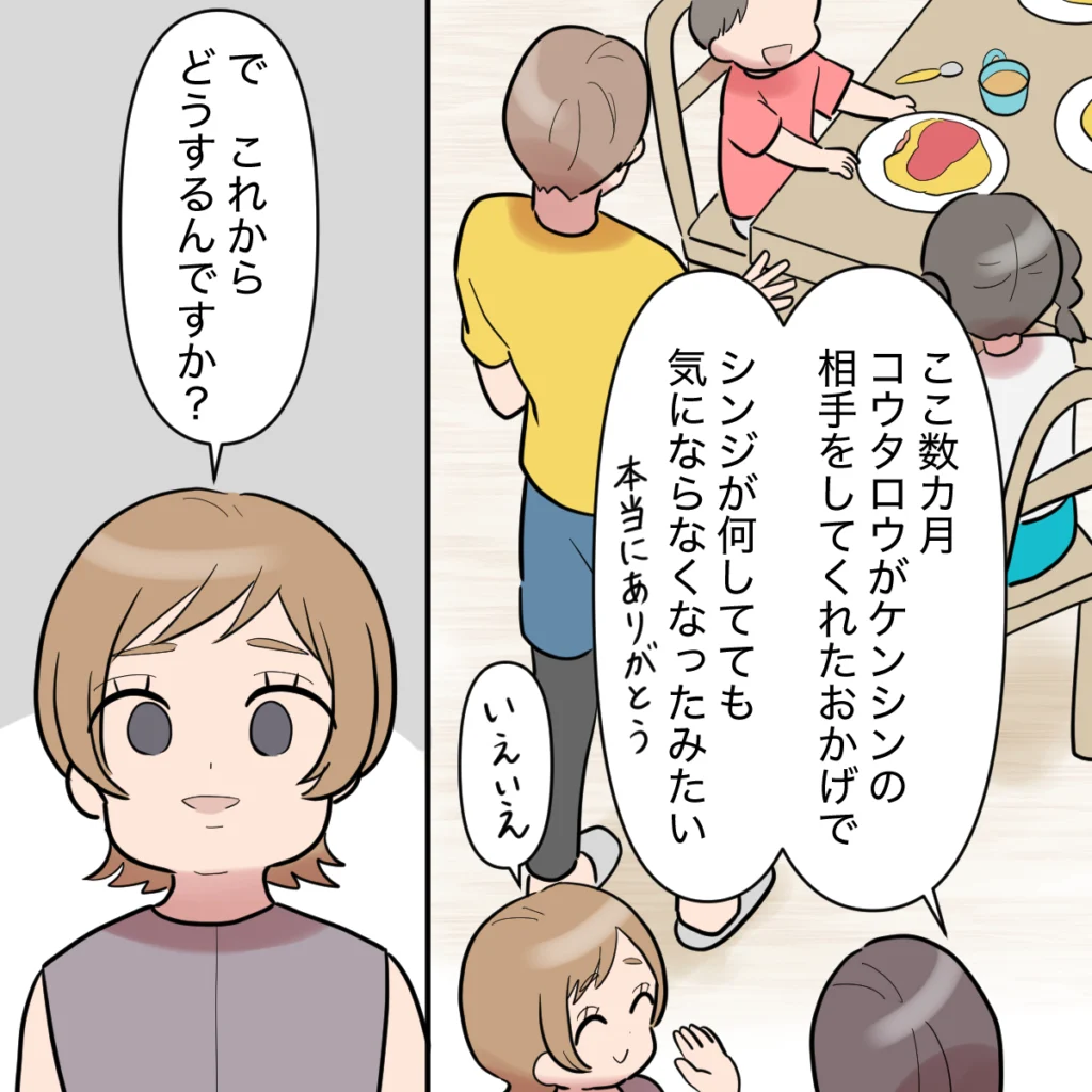 ユラちゃんの提案は見事成功。自分よりもコウタロウに懐くケンシンの姿に焦りを感じたのか、シンジは今さらになって、私たちと過ごそうとしてきました。だけど、もう何もかも手遅れです。私もケンシンも、もうシンジを必要としていませんでした。