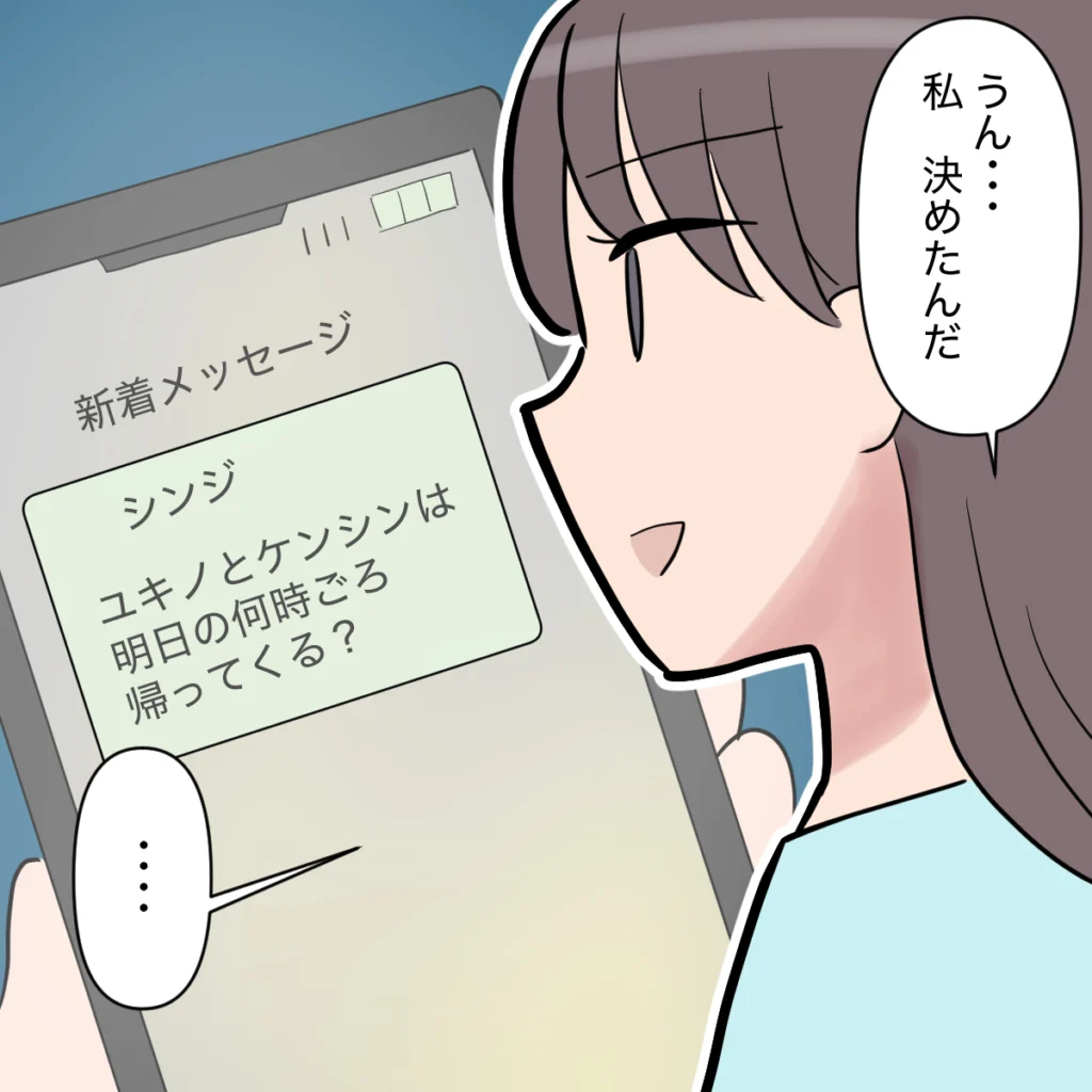 「うん・・・私決めたんだ」私はシンジとこれからのことをきちんと話し合う覚悟を固めました。すると、タイミングを見計らったように、シンジから『ユキノとケンシンは、明日の何時ごろ帰ってくる?』とメッセージが届きました。