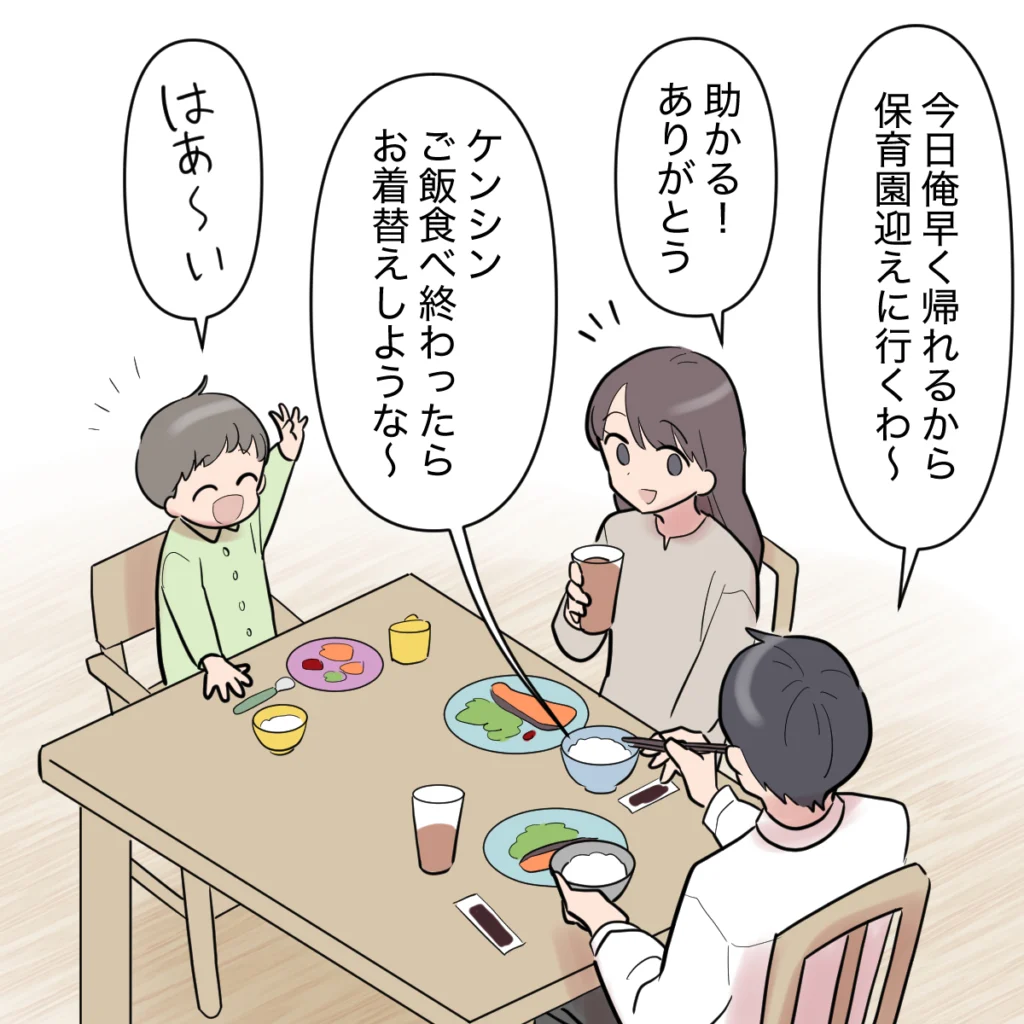 カオルさんを優先しなくなったシンジは、私たちを一番に考えてくれる、家族思いのパパになりました。「今日、俺早く帰れるから保育園迎えに行くわ、ケンシンご飯食べ終わったらお着替えしような」育児にも協力的で、ケンシンのお世話も進んで引き受けてくれます。