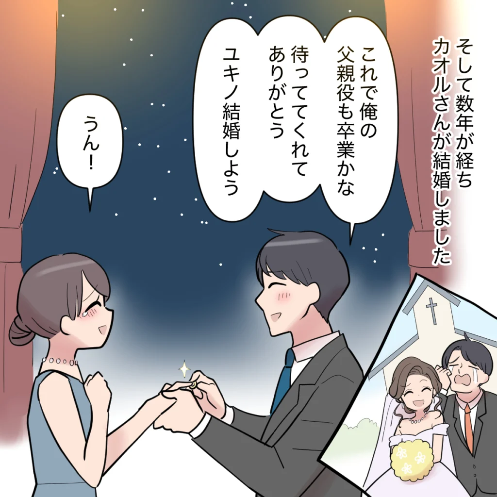 それから数年が経ち、カオルさんが結婚しました。「これで俺の父親役も卒業かな・・・待っててくれてありがとう、ユキノ結婚しよう」シンジはそう言って、私の薬指に指輪をはめてくれました。付き合っていた頃、カオルさんを優先するシンジに憤りを感じたこともあったけど、これでようやく2人の人生が始まります。