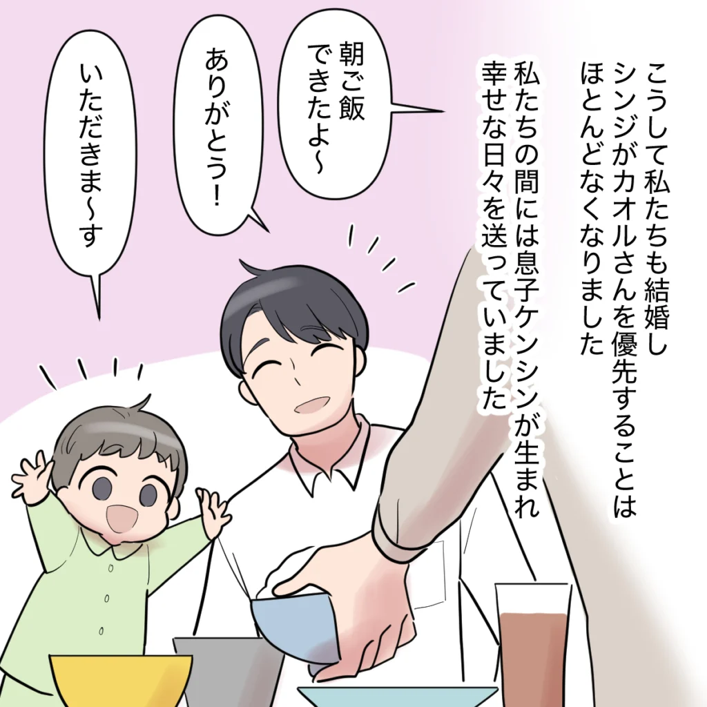 お互いに家庭ができたこともあり、結婚してからはシンジがカオルさんを優先することはほとんどなくなりました。やがて私たちのもとに息子のケンシンが生まれ、家族3人で幸せな日々を送っていました。