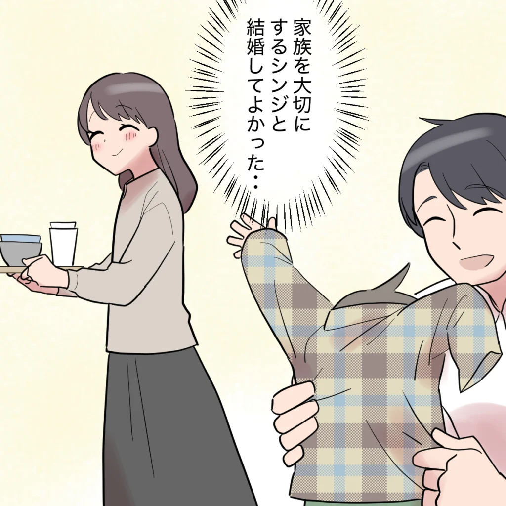 付き合っていた頃は、カオルさんとの関係にやきもきすることもあったけど、家族を大切にするシンジと結婚してよかった。家族優先なところが素敵だと感じた、あの頃の自分の選択は間違っていませんでした。・・・しかし、そんな幸せな時間は長くは続きませんでした。