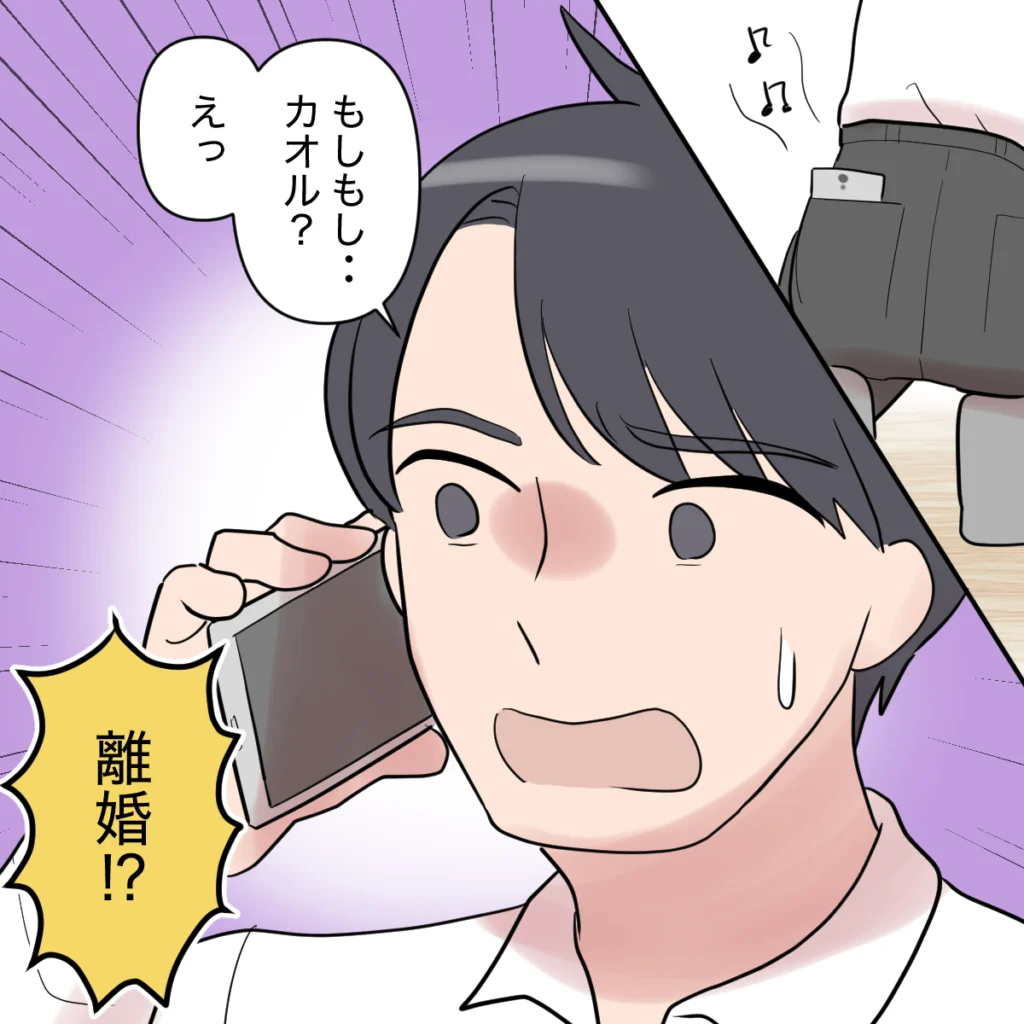 突然、シンジのスマホに着信が入ります。慌てて電話に出た彼は、「もしもし・・・カオル?えっ、離婚!?」と血相を変えて言いました。