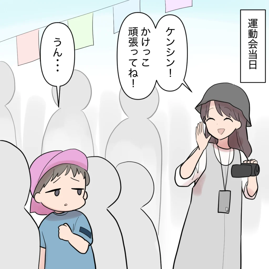 運動会当日。シンジは予定通りタイガくんの運動会へ行き、ケンシンの運動会へは私一人で行きました。私はモヤモヤする気持ちを隠し「ケンシン!かけっこ頑張ってね!」と笑顔で声をかけましたが、ケンシンはパパの姿がないことに不安そうな表情をしていました。
