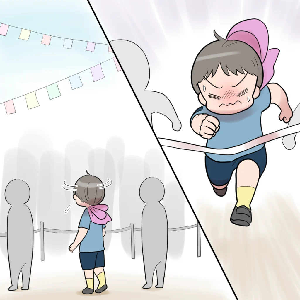 競技はどんどん進んでいき、ケンシンのかけっこの順番がやってきました。間に合ったら行くと言っていたシンジはまだ来ていません。真剣な顔で必死に走ったケンシンは、見事一着でゴールテープを切りました。ゴールした後、嬉しそうにしていたケンシンは、ふと不安そうな顔になり周りをキョロキョロと見回していました。きっとシンジを探していたんだと思います。そんなケンシンの様子に胸がギュッと締め付けられました。