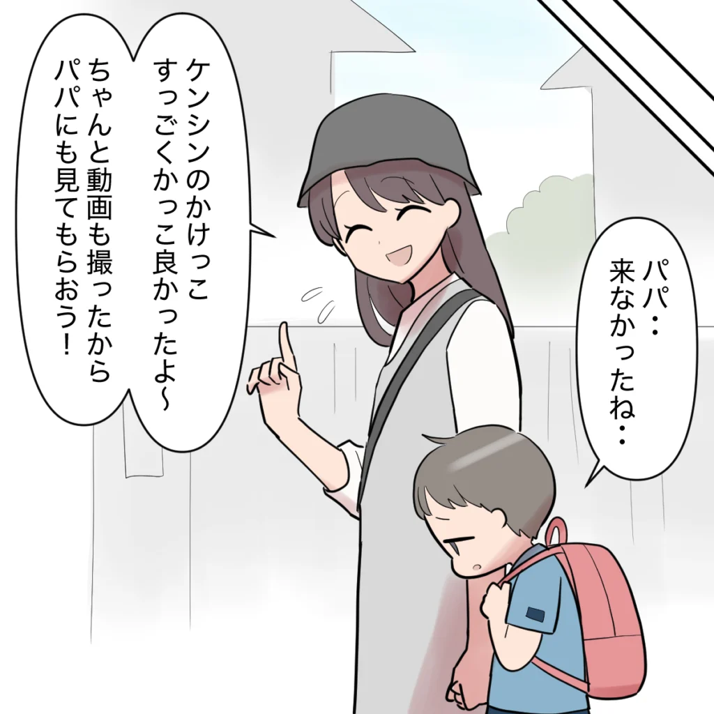 運動会の帰り道、「パパ・・来なかったね・・」としょんぼりするケンシンに「ケンシンのかけっこ、すっごくかっこ良かったよ~。ちゃんと動画も撮ったから、パパにも見てもらおう!」と必要以上に明るく振る舞いながらなんとかケンシンを元気づけようと必死の私。