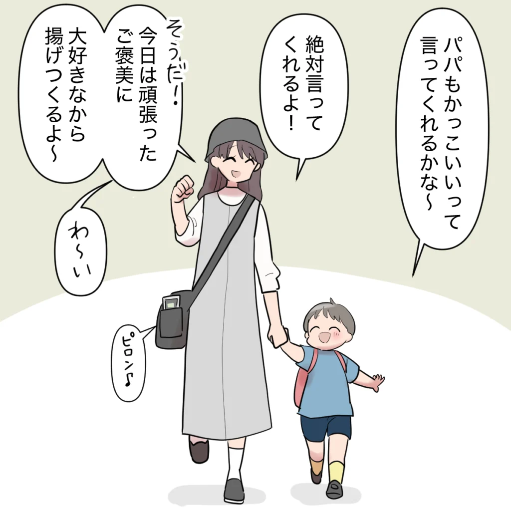 すると「パパもかっこいいって言ってくれるかな~」と笑顔になってくれたケンシンを見てホッとしながら「絶対言ってくれるよ!そうだ!今日は頑張ったご褒美に大好きなから揚げつくるよ~」と言うと「わ~い」と喜んでくれました。運動会に来られなかった分、シンジが帰ってきたらケンシンをたくさん褒めてもらおう。そう思っていたのですが・・。