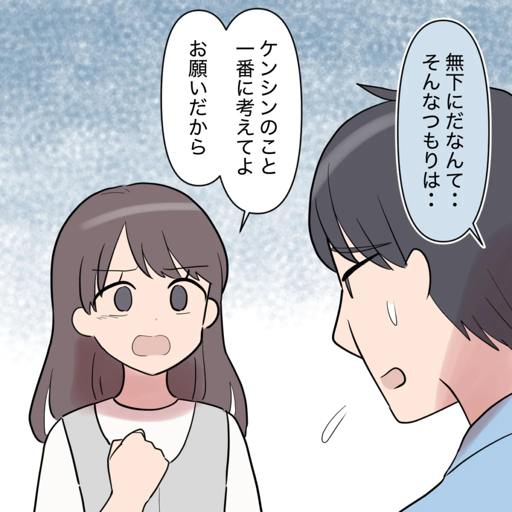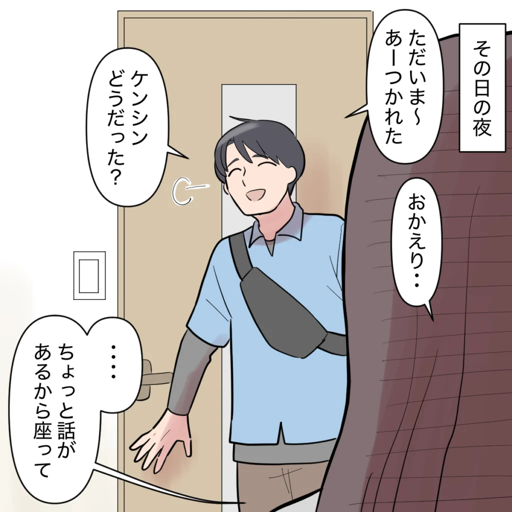 その日の夜。ケンシンがもうとっくに寝てしまった後に「ただいま~。あーつかれた。ケンシンどうだった?」と呑気に帰って来たシンジ。私はこみ上げる怒りを抑えながら「おかえり・・。ちょっと話があるから座って」とシンジに伝えました。