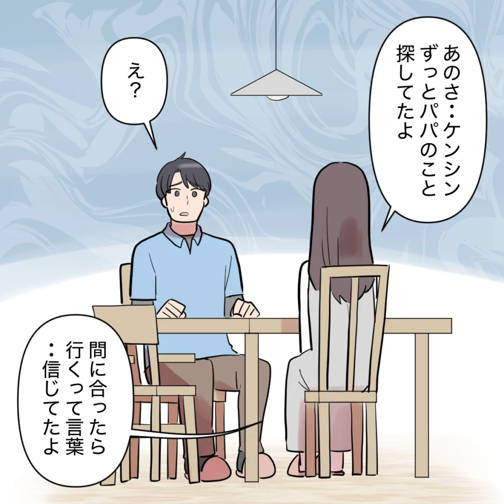 息子ケンシンの運動会よりも、甥っ子タイガくんの運動会を優先したシンジ。ケンシンには「間に合ったら行く」と期待を持たせておきながら、結局シンジはケンシンの運動会には来ませんでした。がんばって1番になったかけっこをパパに見てもらえずしょんぼりするケンシンの姿に胸が痛みました。どうしてケンシンがこんな思いをしなければいけないの?それでも、シンジが帰ってきたら動画を見せてたくさんケンシンを褒めてもらおう、ケンシンの好きなから揚げを作って3人で夜ご飯を食べながら運動会の話をたくさんしよう、そう思っていたのに・・。シンジはカオルさん達と外食に行ってしまったのです。