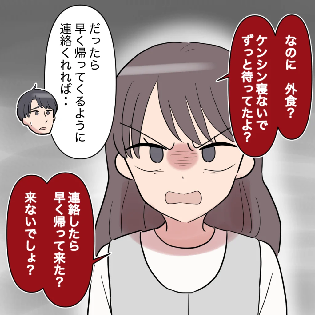 「なのに外食?ケンシン寝ないでずっと待ってたよ?」私が怒りを滲ませながらそう言うと、シンジは「だったら早く帰ってくるように連絡くれれば・・」と言いました。「連絡したら早く帰って来た?来ないでしょ?」そう返すと、シンジは何も言いませんでした。
