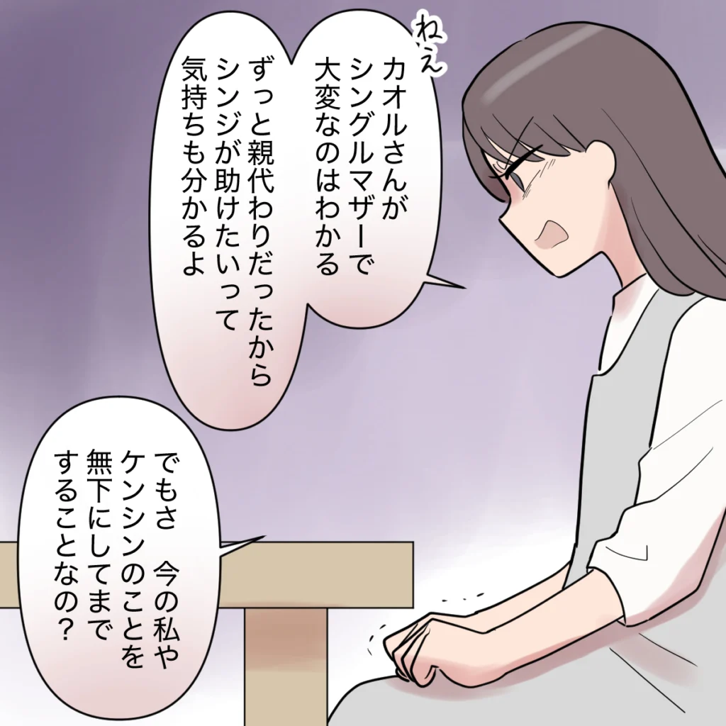 「ねぇ。カオルさんがシングルマザーで大変なのはわかる。ずっと親代わりだったからシンジが助けたいって気持ちも分かるよ。でもさ、今の私やケンシンのことを無下にしてまですることなの?」私はずっと我慢していた気持ちをシンジにぶつけました。