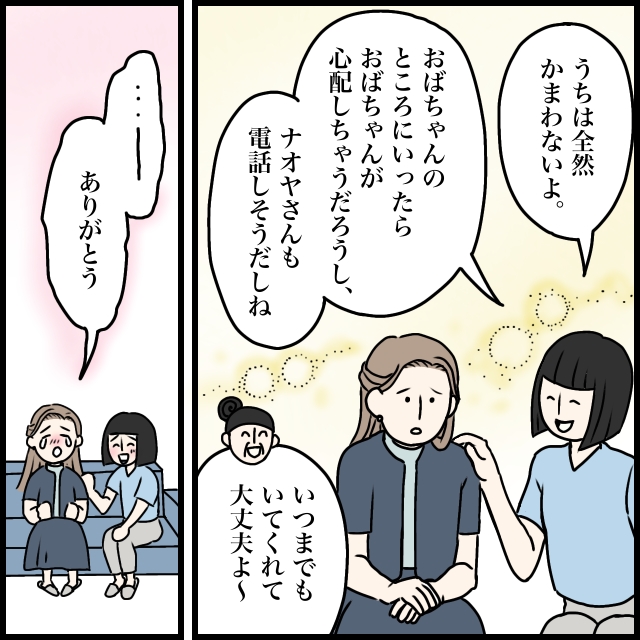 「うちは全然かまわないよ。おばちゃんのところにいったらおばちゃんが心配しちゃうだろうし、ナオヤさんも電話しそうだしね」ミホがそう言ってくれ、「いつまでもいてくれて大丈夫よ~」とミホのお母さんも優しい言葉をかけてくれ、「・・ありがとう」やっと少し安心できて思わず涙が。