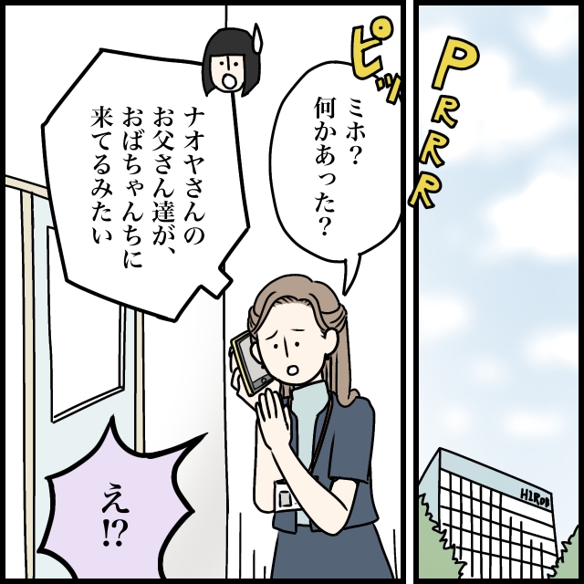 そして翌日。ミホさんから電話がありました。「ミホ?何かあった?」そう聞くと、「ナオヤさんのお父さん達が、おばちゃん家に来てるみたい」ミホの言葉に「え!?」と驚いて、