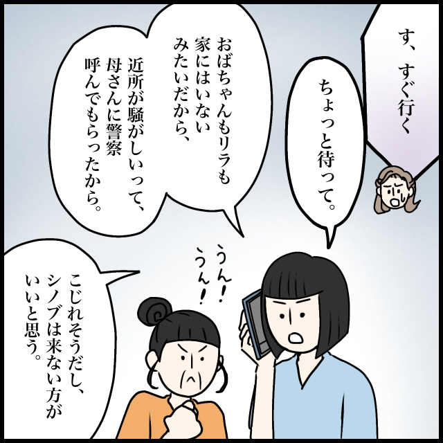 「す、すぐ行く」と答えると、「ちょっと待って。おばちゃんもリラも家にはいないみたいだから、近所が騒がしいって、母さんに警察呼んでもらったから」「こじれそうだし、シノブは来ない方がいいと思う」ミホがそう言うと、お母さんも隣で力強く頷いていました。