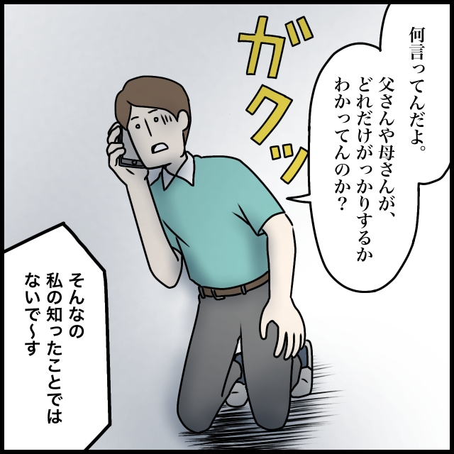 私達が離婚していることを知って愕然とするナオヤ。動揺を隠し切れない様子で私を責めました。「父さんや母さんが、どれだけがっかりするか分かってんのか?」そもそも私はお金を受け取る気がないと言っていたのに、勝手に家を建てると盛り上がっていたのはあなた達。「そんなの私の知ったことではないで~す。」