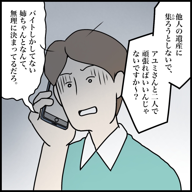 「他人の遺産に集ろうとしないで、アユミさんと2人で頑張ればいいんじゃないですか~?」と言ってやりました。ナオヤが「バイトしかしてない姉ちゃんとなんて無理に決ってるだろ」と言う通り、ずっと実家に住み、たいして働きもせず推し活ばかりしているアユミさんとでは無理だよね。知ってる。