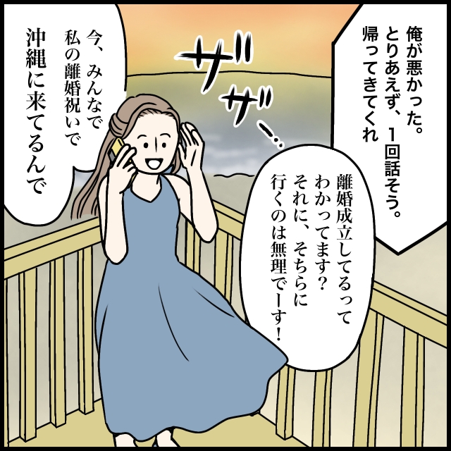 だんだん弱気になり、「俺が悪かった。とりあえず、1回話そう。帰ってきてくれ」と簡単に言うナオヤに、「離婚成立してるって、分かってます?」と伝えました。それに、そちらに行くのは無理。だって私たち、離婚祝いの沖縄旅行に来てるんで!