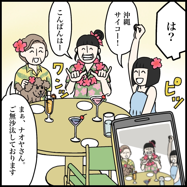 絶句するナオヤは無視して、スマホを動画に切り替えました。「沖縄サイコー!」「まぁ、ナオヤさん。ご無沙汰しております。」そこに写っているのは母と愛犬リラ、そして近所でずっと寄り添ってくれた幼馴染のミホ、ミホのお母さん。みんな最高の笑顔です。
