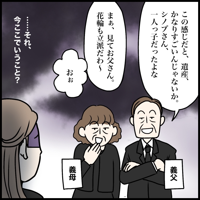 義両親は、「この感じだと、遺産、かなりすごいんじゃないか。シノブさん、一人っ子だったよな」ニヤニヤしながら言う義父に義母も「まぁ見てお父さん。花輪も立派だわ」って・・・それ、今ここで言うこと?とドン引きして固まってしまった私です。